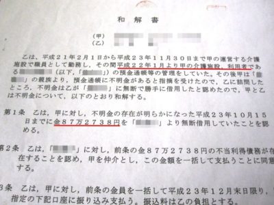 15年ほど前の出来事であるが、この和解書は施設と元職員の間で交わされた文書である